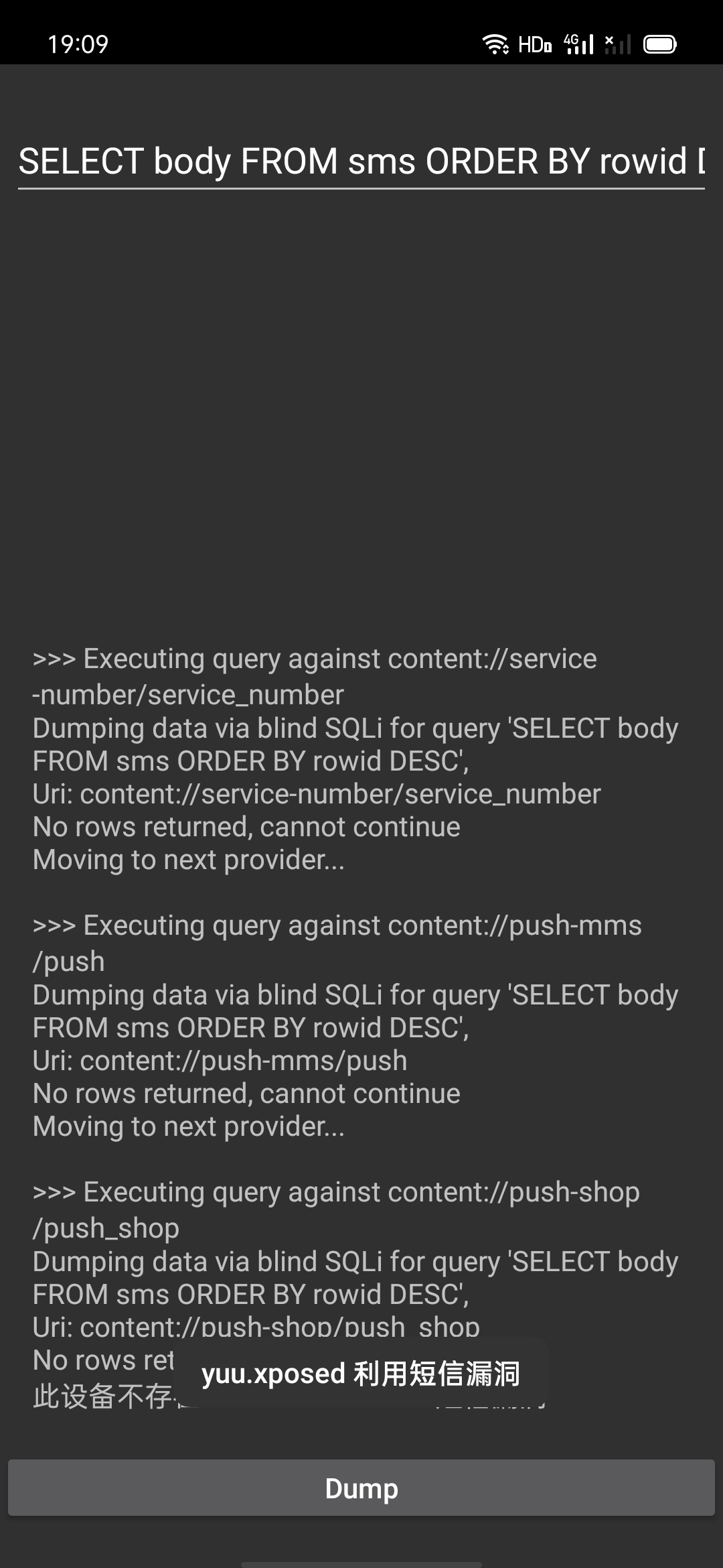 漏洞: CVE-2025-10184 勾选: com.android.providers.telephony 日志: /storage/emulated/0/Android/data/com.android.providers.telephony/files/yuu.log 效果:
